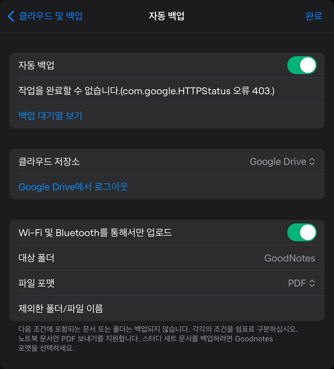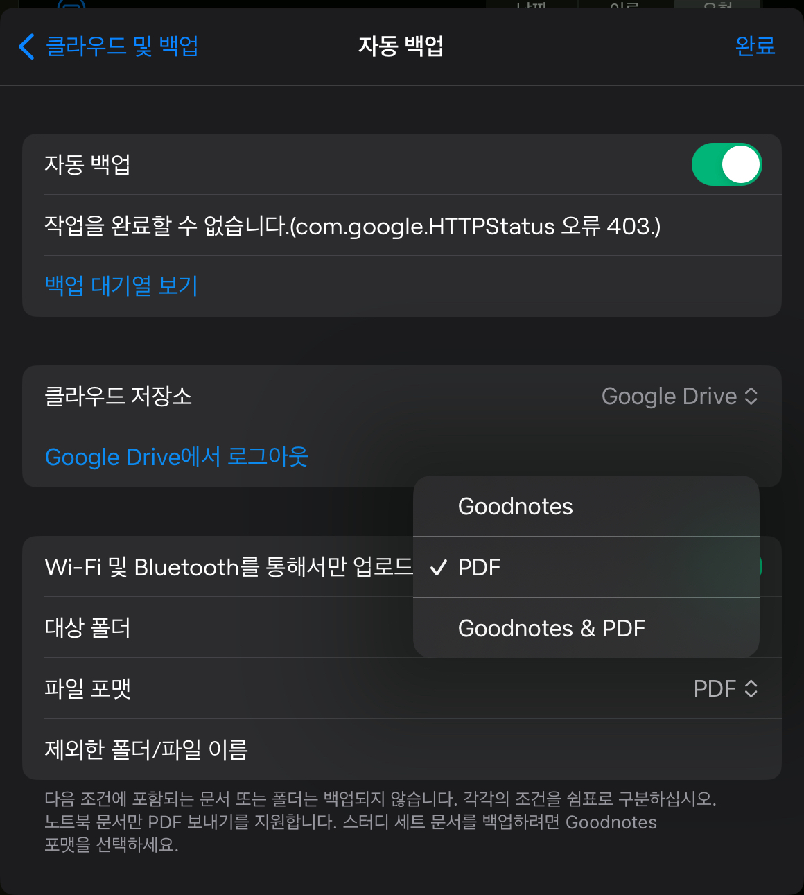이렇게 구글 드라이브에 백업을 해주면 굿노트의 파일들이 전부 구글 드라이브에 올라가게 됩니다