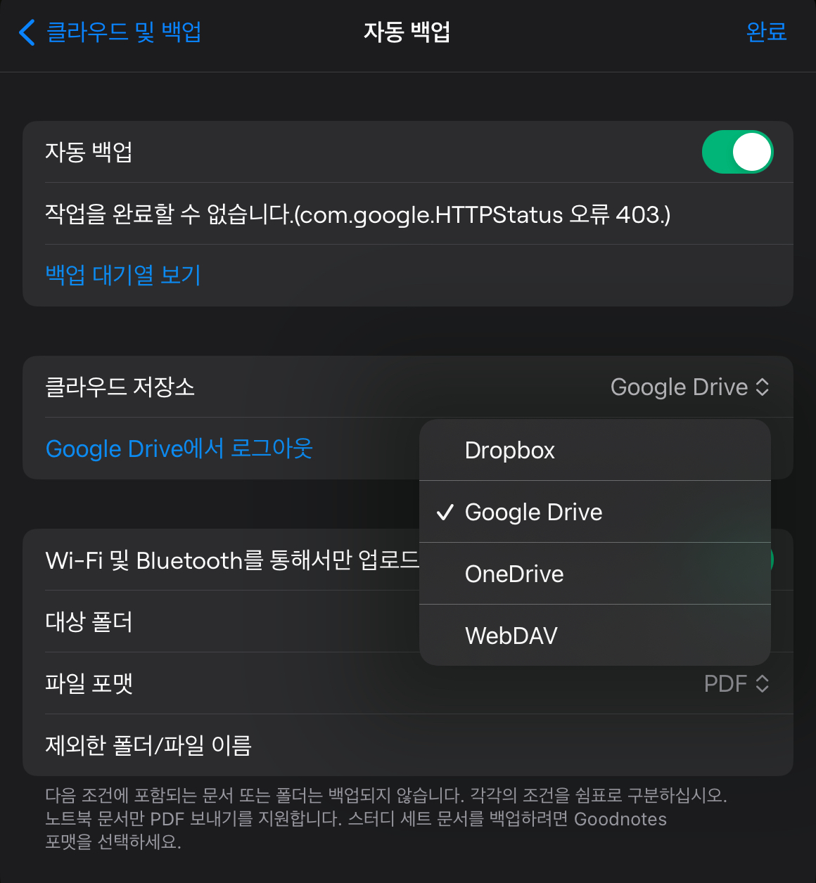 드롭박스, 원드라이브 뭐 이런것도 쓸 수 있나본데 전 '구글 드라이브'로 설정했습니다